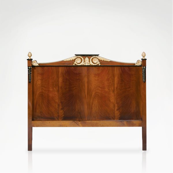This elegant headboard sits in a mahogany frame, with vertical posts finishing in touches of black lacquer wood and gold leaf, which continues along the top of the headboard to a central decorative adornment.