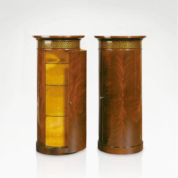 Standard sizes – Ø 60x130h cm. This striking, circular bar cabinet is handcrafted from mahogany and opens up to reveal levels of glass shelving displayed under interior lighting. The exterior is completed with sycamore inlay and upper bands of black lacquer wood. This bar cabinet can be custom made. Upon request specific modifications can be applied to dimensions, design, finish or materials. Contact us for more details on our custom made production.