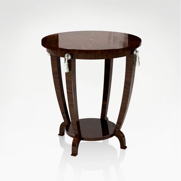 This end table is handcrafted from rosewood and four silver leaf tassel wood. The table is supported by four legs that sweep under the table, and the table is bought together by a second shelf of rosewood that sits directly under the tabletop.