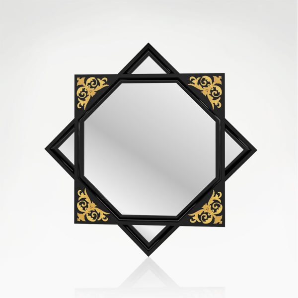 Standard sizes – 120x120h cm. This mirror is framed by two overlapping square frames of black lacquer wood, one tilted at 45 degrees. The resulting corners of the un-rotated frame are decorated with delicate sycamore inlay that beautifully contrasts with the dark wood. This mirror can be custom made. Upon request specific modifications can be applied to dimensions, design, finish or materials. Contact us for more details on our custom made production.
