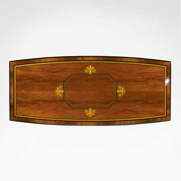 Standard sizes – 300x130x78h cm. This mahogany dining table features a tabletop decorated with delicate sycamore inlay and edged with a solid lining of black lacquer wood. The tabletop rests on two imposing pillars that splay out to highly decorative gold leaf feet. This dining table can be custom made. Upon request specific modifications can be applied to dimensions, design, finish or materials. Contact us for more details on our custom made production.