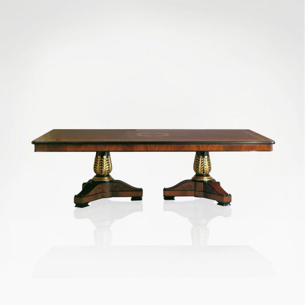 Standard sizes – 250x130x75h cm. This elegant dining table rests on two grand columns of black lacquer wood, decorated with gold leaf. The columns each lead down to a large triangular base, edged with black lacquer wood, matching the mahogany tabletop which is finished with identical edging. This dining table can be custom made. Upon request specific modifications can be applied to dimensions, design, finish or materials. Contact us for more details on our custom made production.