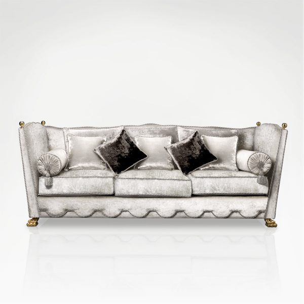 Standard sizes – 245x95x109h cm. This striking sofa is housed in a high frame that leads down to gold leaf finished feet. The back and seat are carefully upholstered and complimented by armrest pillows and scatter cushions for added comfort. Choose from a wide range of colours. This sofa can be custom made. Upon request specific modifications can be applied to dimensions, design, finish or materials. Contact us for more details on our custom made production.