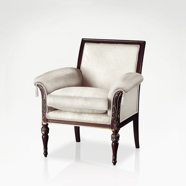 This stylish armchair features comfortable rounded armrests leading into a back framed in black lacquer wood to match the frame and legs, the front pair of which are decorated with gold leaf. The seat, back and arms are all carefully upholstered and a cushion is provided for added comfort. Choose from a wide range of colours.