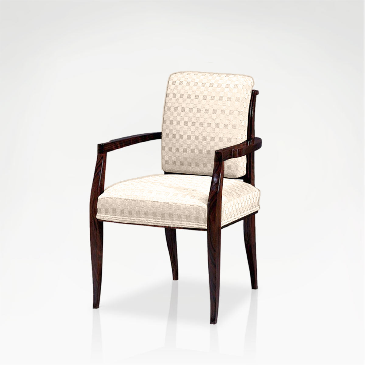 Standard sizes – 57x58x90h cm. This armchair is comprised of a handcrafted rosewood frame, with tapered, sweeping legs and integrated armrests. The backrest and seat are carefully upholstered in fabric. Choose from a wide range of colours. This armchair can be custom made. Upon request specific modifications can be applied to dimensions, design, finish or materials. Contact us for more details on our custom made production.